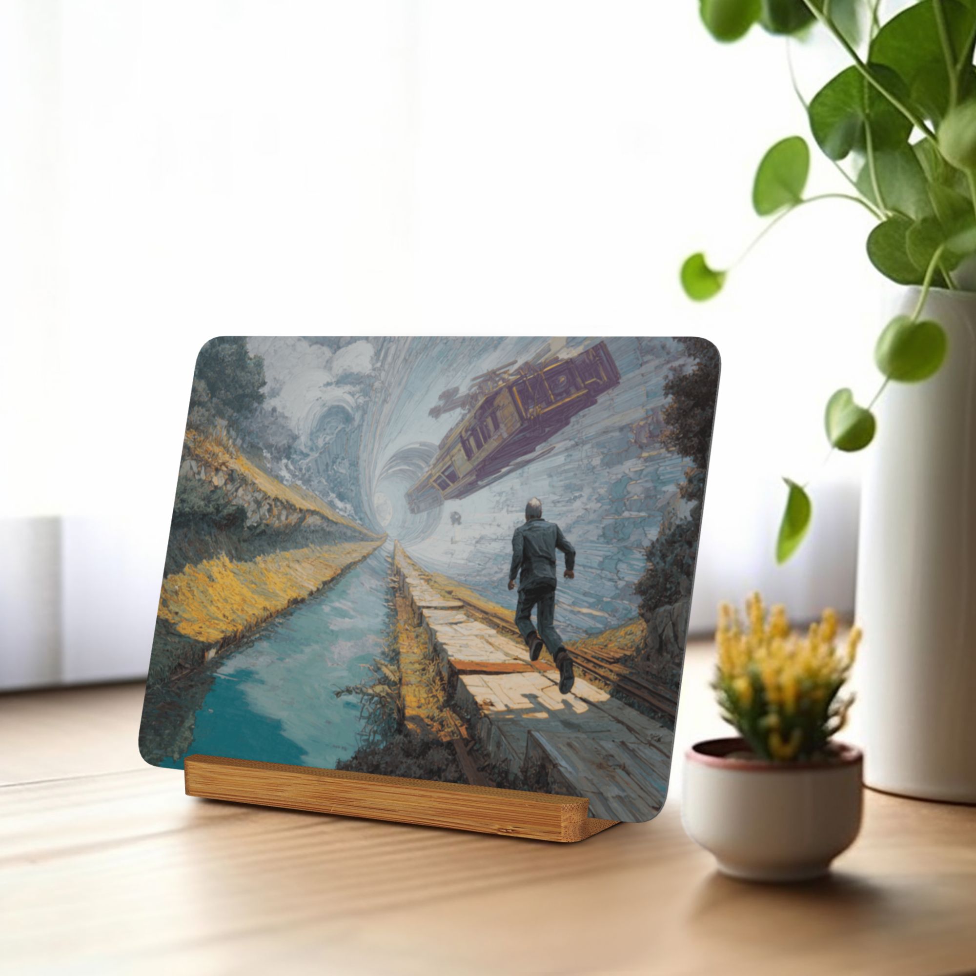 Graffiti Style Figure Metal Photo Display – Horizontal Matte Aluminum Art Print with Wooden Stand, Urban Desk Decor