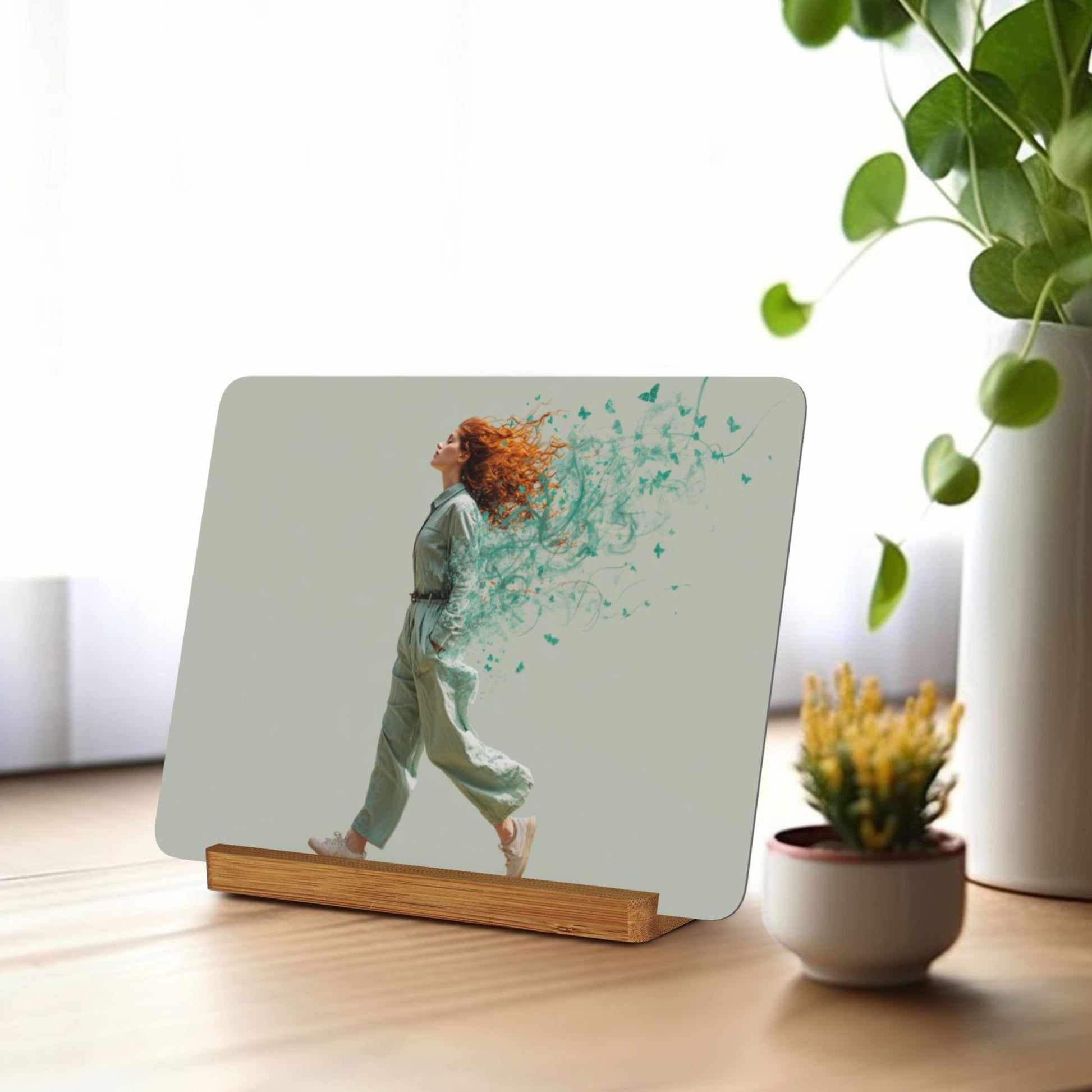 Artistic Female Figure Metal Photo Display – Horizontal Aluminum Print with Wooden Base, Feminine Modern Desk Decor